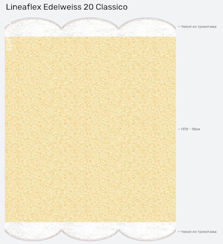 Матрас Эдельвейс представляет собой простое и технологичное решение: наполнитель из высокоэластичной пены Ergoflex обладает массой достоинств, а чехол из синтетического жаккарда или дышащего трикотажа добавит комфорта. Безопасные, удобные, гипоаллергенные, долговечные материалы. Отдыхайте с удовольствием! Матрасы Lineaflex – это высокая анатомичность со специальным эффект и экологичные материалы, изготовленные на современном оборудовании с использованием последних технологий и разработок. Оценить удобство нашей продукции вы можете на фирменных бренд-секциях, торговых точках Lineaflex, а также у наших дилеров.