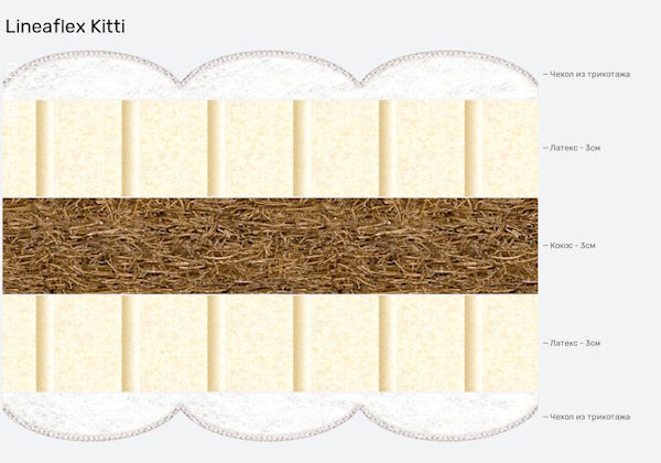 Детский ортопедический матрас Kitti от компании «Линия Флекс» - превосходный выбор и 100% гарантия здорового сна Вашего чада! Максимальная допустимая нагрузка – 50 килограмм. Оснащен «беспружинным» пружинным блоком.