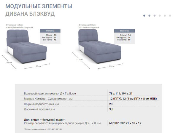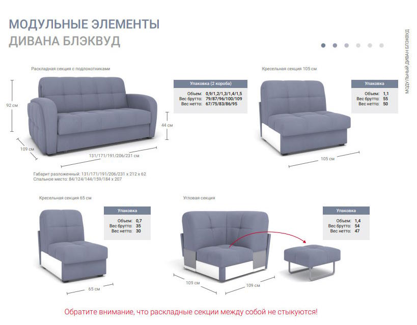 Огромный выбор размеров и типов модулей позволяет составить диван для любого помещения. На диване удобно сидеть и спать: механизм аккордеон при раскладывании образует высокое ровное спальное место, по комфорту сравнимое с настоящими кроватями. Все модули могут быть исполнены с матрасами ППУ или НПБ высотой 12 см (исключение угловая секция — только с НПБ).